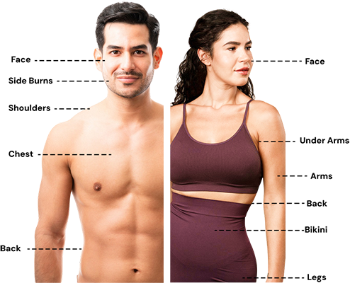 Embrace total smoothness from head to toe. Our comprehensive full-body laser treatment offers you the ultimate freedom from unwanted hair on your legs, arms, face, bikini area, and more.